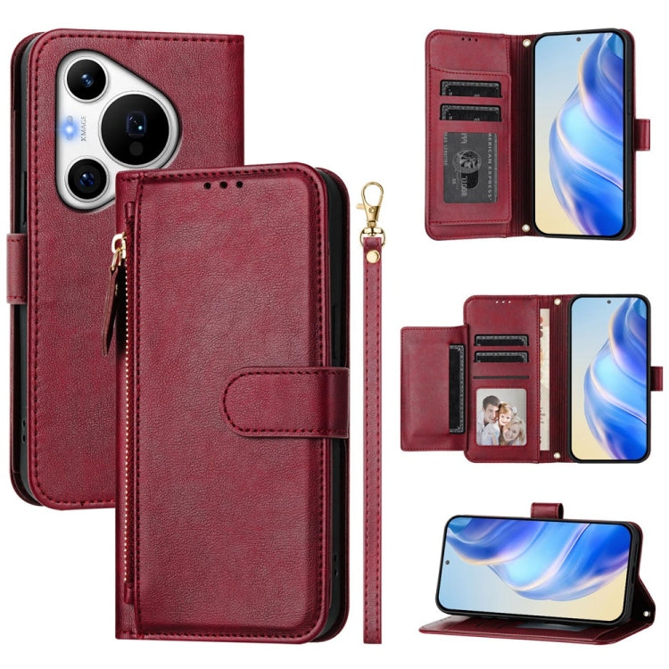 Funda de Cuero con Cremallera y Ranuras para Tarjetas Huawei Pura 70 Pro/Pura 70 Pro+ (Rojo Oscuro)