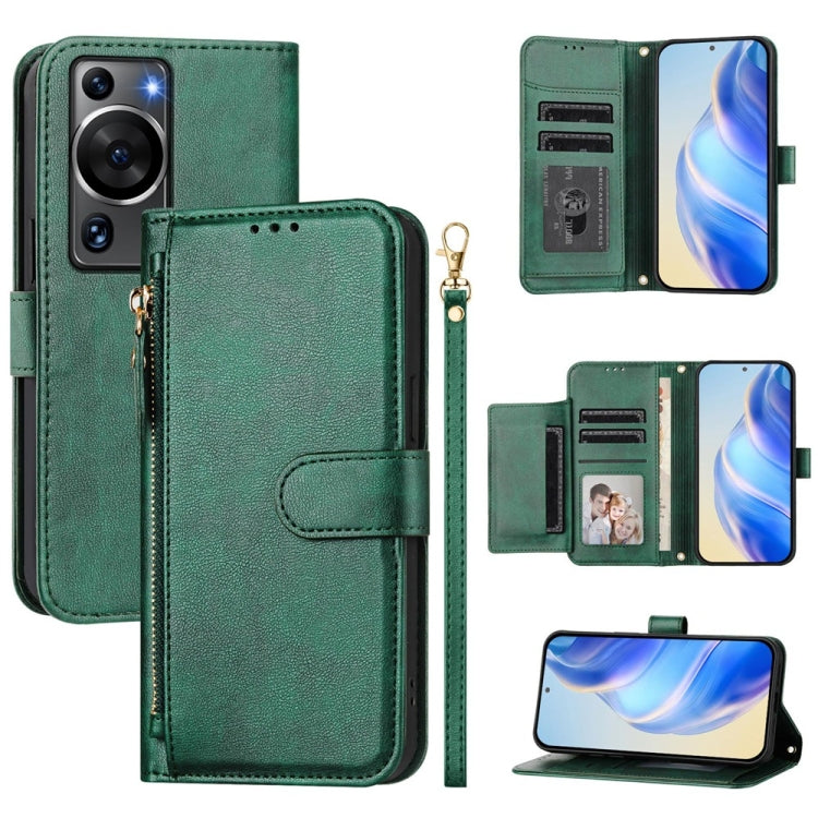 Funda Cuero Tipo Billetera Huawei Pura 70 con Cremallera y Ranuras para Tarjetas (Verde)