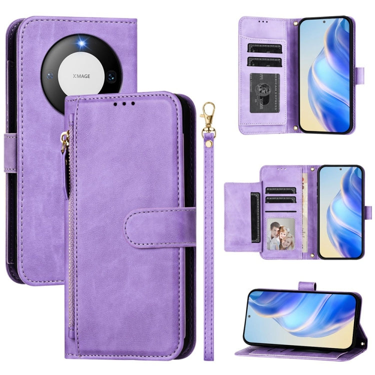 Funda de Cuero Tipo Billetera para Huawei Mate 60 Pro/60 Pro+ con Cremallera y Ranuras (Morado)