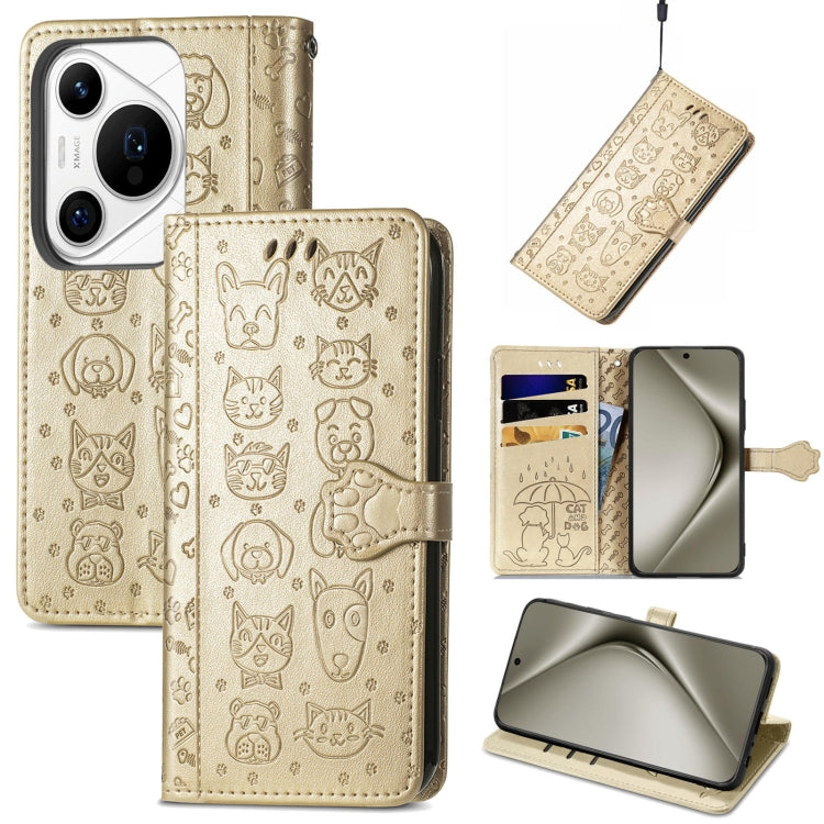 Funda de Cuero para Huawei Pura 70 Ultra con Relieve Perros y Gatos (Dorado)