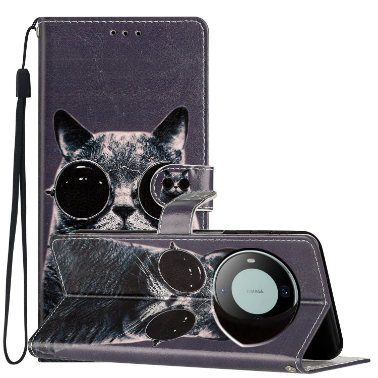 Funda de Cuero para Huawei Mate 60 con Dibujo Coloreado Gato de Gafas de Sol