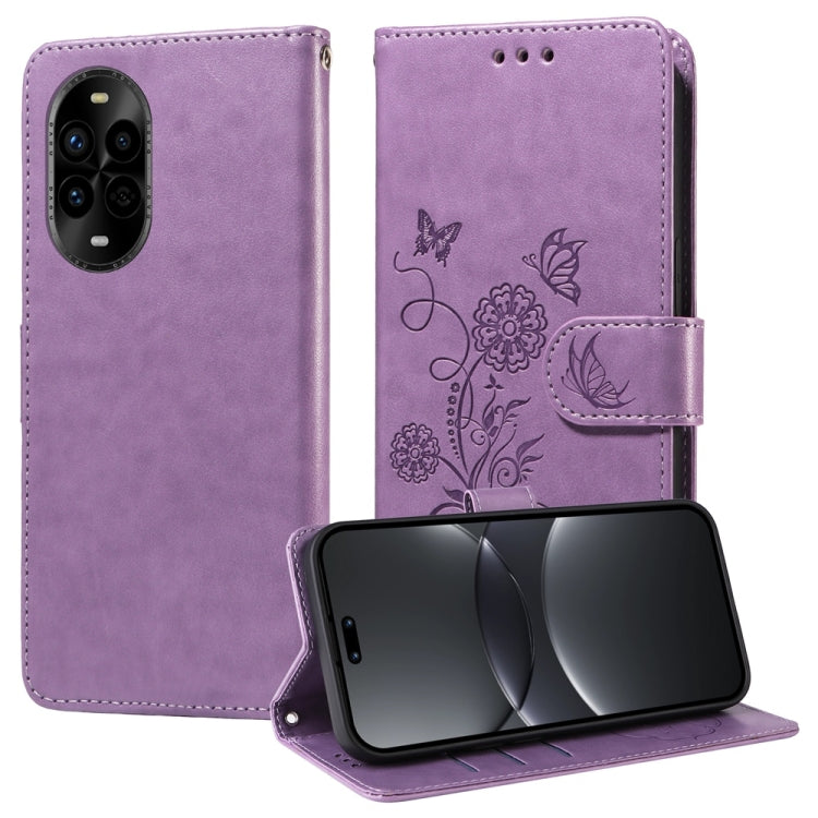 Funda de Cuero Huawei Nova 13 Pro con Diseño de Mariposas y Flores en Relieve (Morado)