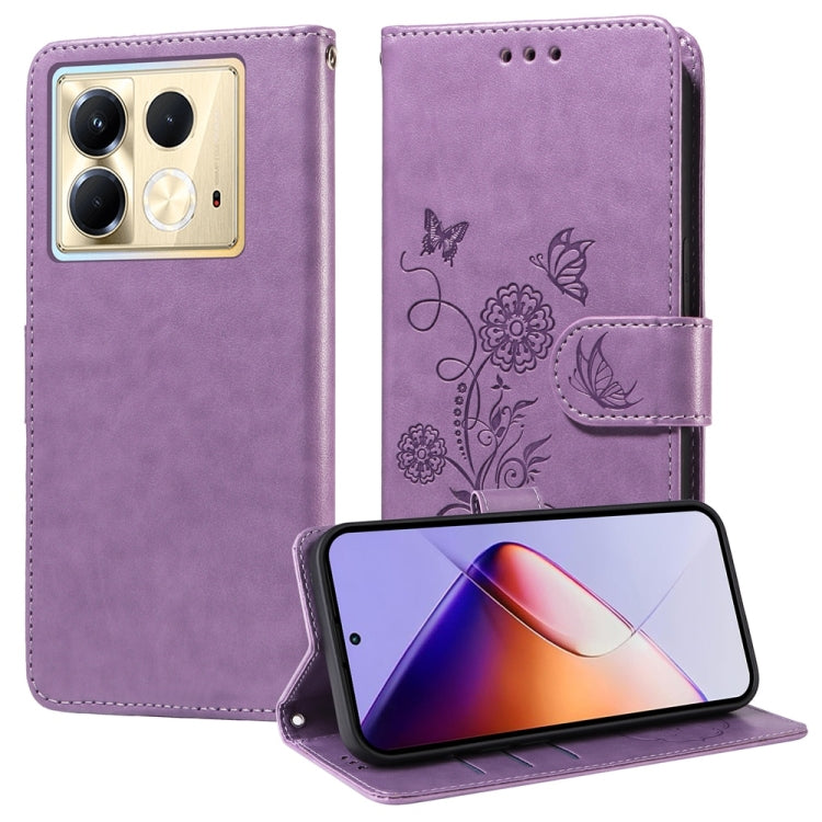 Funda de Cuero para Infinix Note 40 5G con Diseño de Mariposas y Flores en Relieve (Morado)