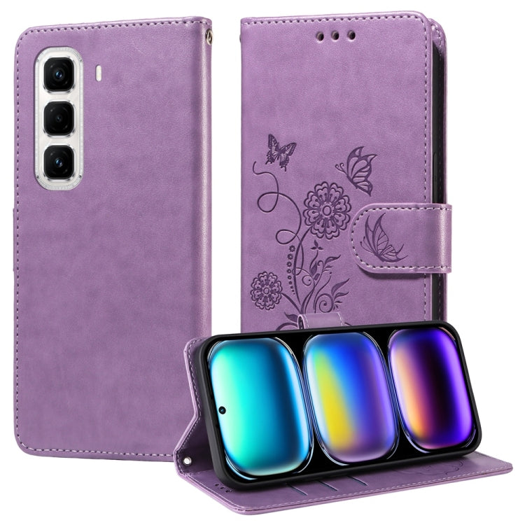 Funda de Cuero para Infinix Hot 50 Pro+ 4G con Diseño de Mariposas y Flores en Relieve (Morado)