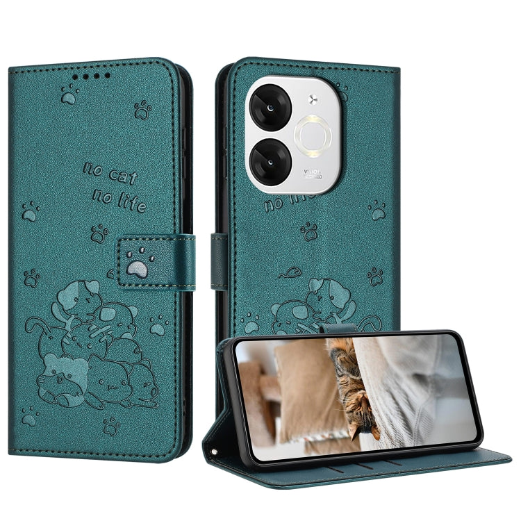 Funda de Cuero con Cordón para Teléfono Itel A80 con Diseño de Gatito en Relieve (Verde Oscuro)