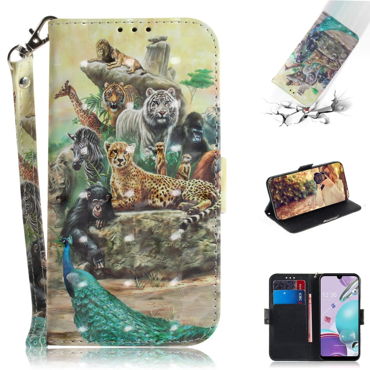Estuche de Cuero Abatible Horizontal para LG K31 con Dibujo 3D, Soporte, Ranuras y Cordón (Zoo)