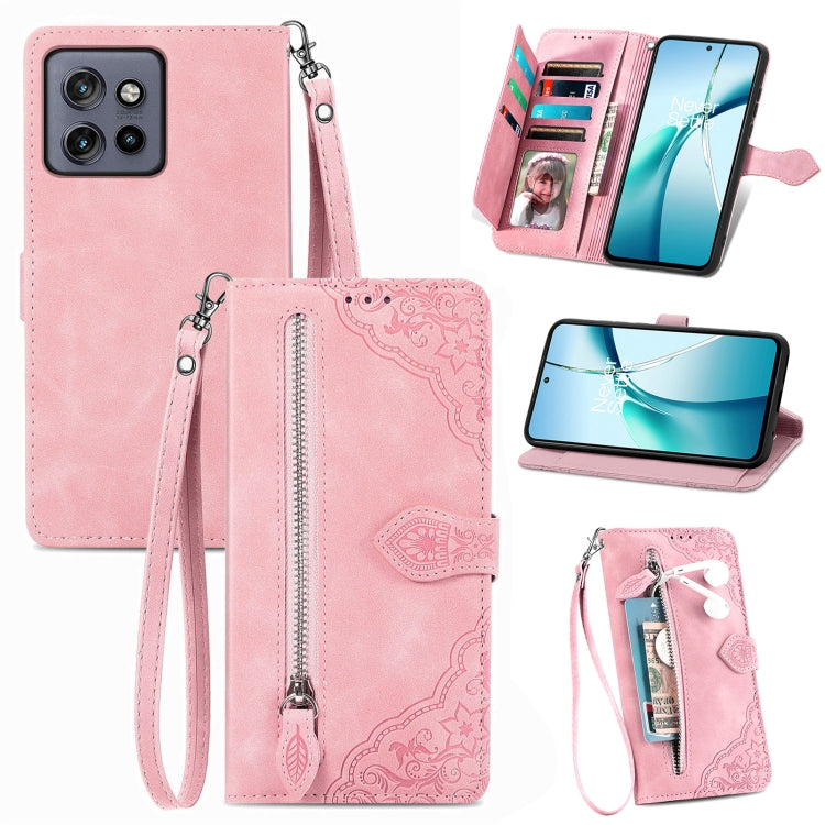 Funda de Cuero con Cremallera y Flores en Relieve para Motorola Moto G75 5G (Rosa)