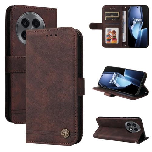 Funda de Cuero OnePlus 13R Ace 5 Ace 5 Pro con Botones de Metal y Diseño Árbol de la Vida (Marrón)