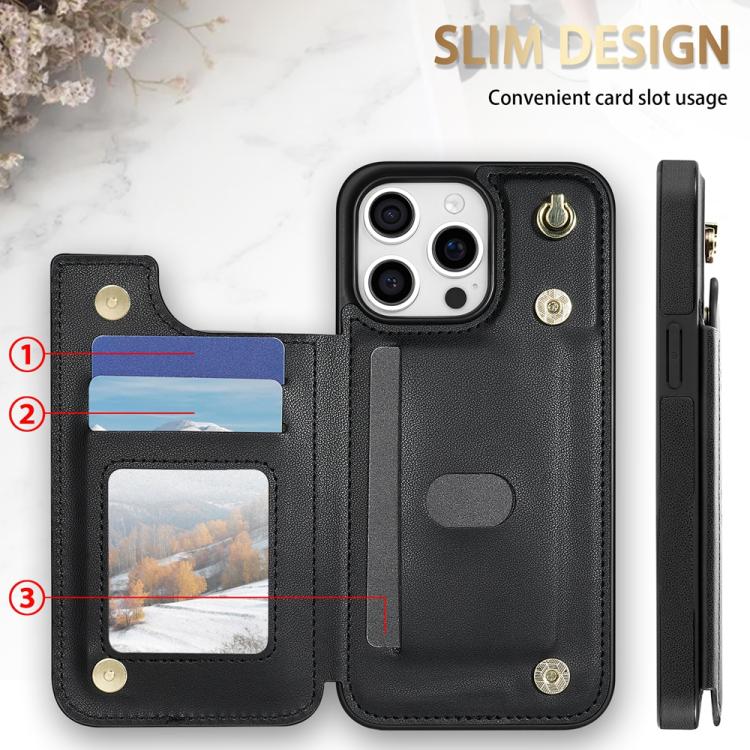 Estuche para Teléfono Rombal iPhone 16 Pro Ranuras Tarjetas Hebilla Doble Cordón (Negro)