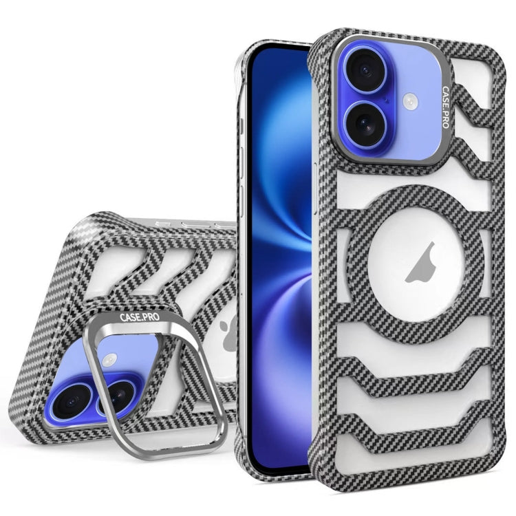 Estuche para Teléfono Magsafe con Soporte y Protección de Lente Fibra de Carbono para iPhone 16 (Gris)