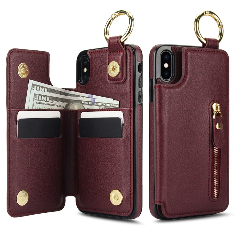 Funda para Teléfono iPhone Xs / X con Bolsa para Tarjetas Doble Hebilla Cremallera (Rojo Granate)