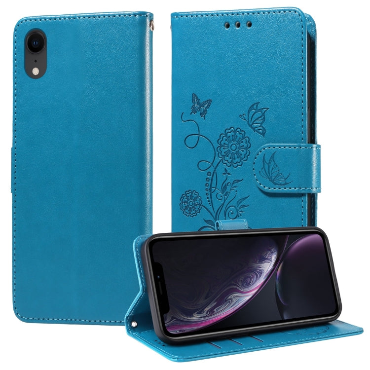Funda de Piel para iPhone Xr Diseño Mariposas y Flores en Relieve (Azul)