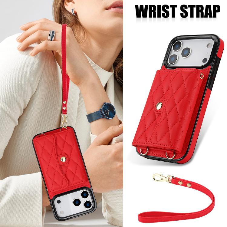 Funda de cuero tipo cartera horizontal con diseño rómbico cruzado para iPhone 17 Pro (roja)