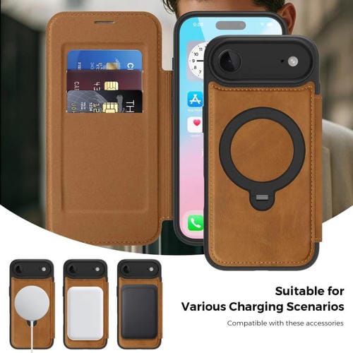 Funda de cuero con protección MagSafe RFID para iPhone 17 con rotación de 360 grados (marrón)