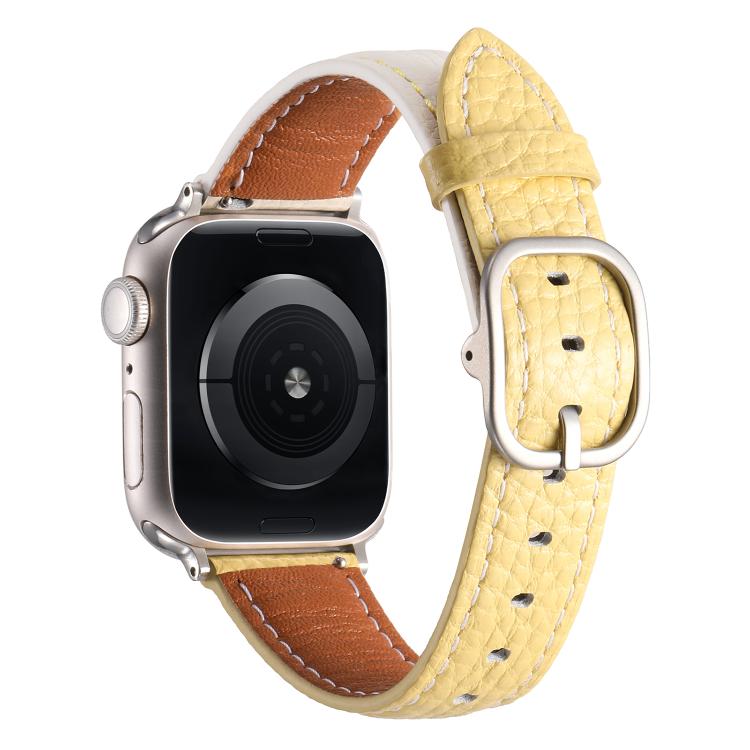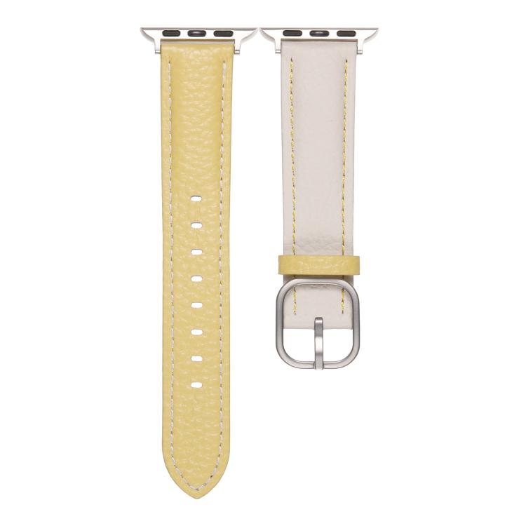 Correa de cuero genuino con textura de lichi y hebilla cuadrada para Apple Watch de 46 mm, 49 mm, 45 mm y 44 mm (blanco y amarillo)