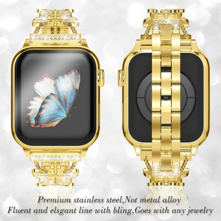 Correa de metal con diamantes en forma de mariposa para Apple Watch 38/40/41/S10 de 42 mm (dorada)