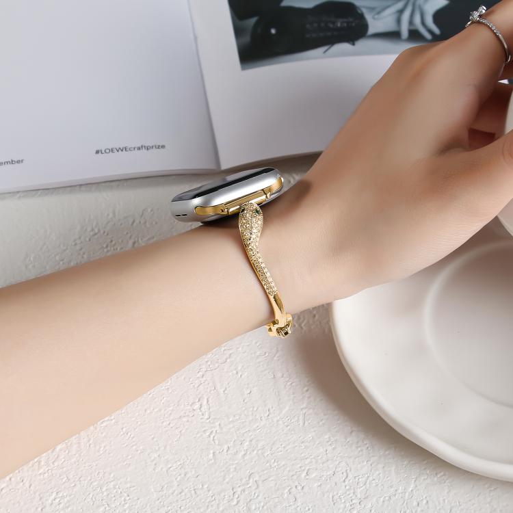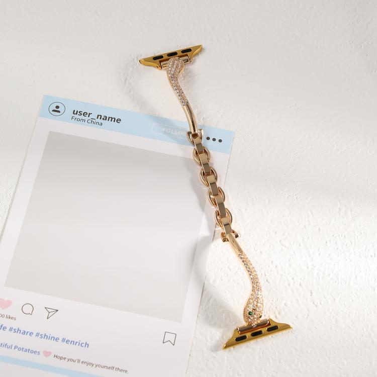 Correa de reloj con cabeza de serpiente y circonita incrustada de cobre para Apple Watch de 42 mm, 41 mm, 40 mm y 38 mm (dorada)