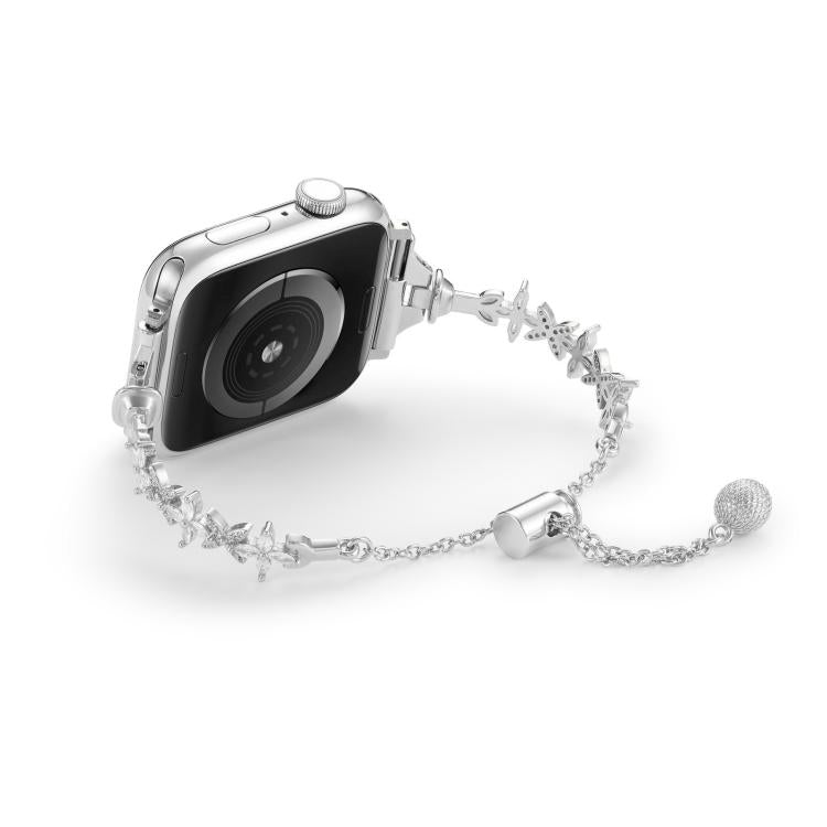 Correa de reloj de aleación de zinc con diamantes y trébol de cuatro hojas para Apple Watch de 46 mm, 49 mm, 45 mm y 44 mm (plateada)