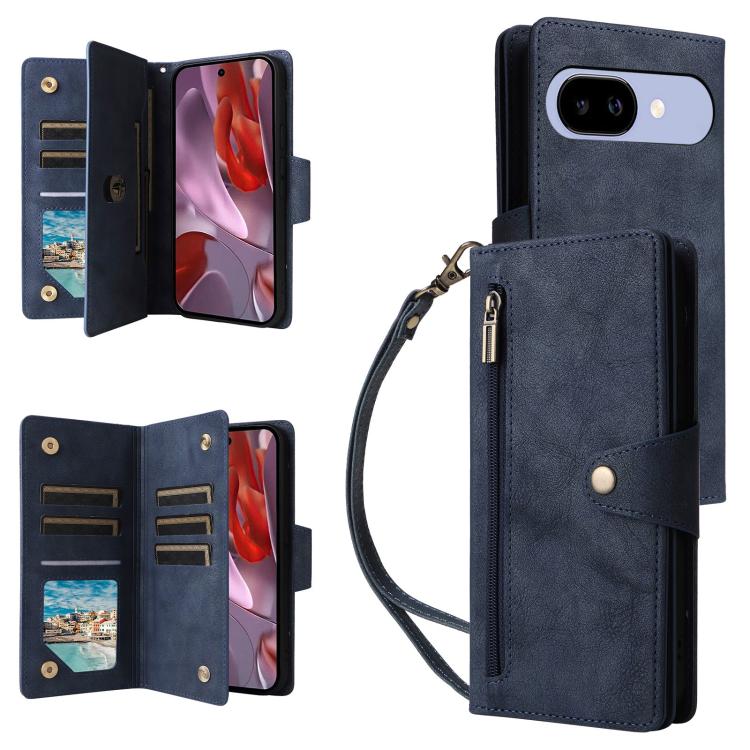 Estuche de Cuero con Tres Pliegues y Hebilla de Remache para Google Pixel 9A (Azul)