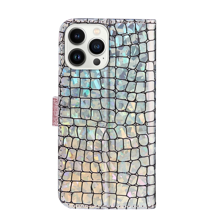 Étui de téléphone en cuir de texture de crocodile assorti de poudre de paillettes laser pour iPhone 14 Pro Max (argent)