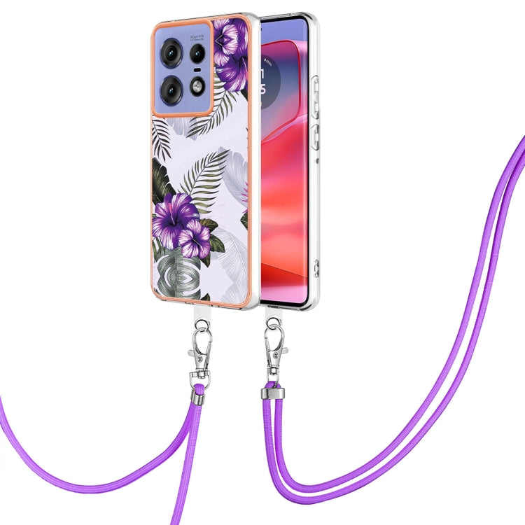 Funda TPU a Prueba de Golpes con Patrón Galvanoplastia IMD para Motorola Edge 50 Pro con Cordón (Flor Morada)