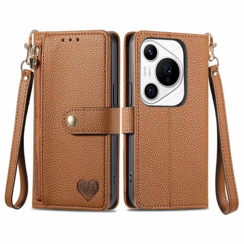 Funda de Cuero con Cordón y Cremallera Love para Huawei Pura 70 Pro+ (Marrón)