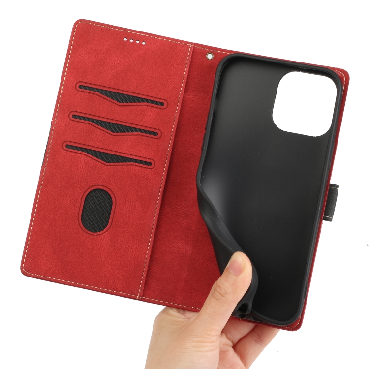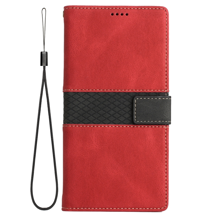 Funda de Cuero con Costuras de Cuadrícula para iPhone 15 Plus con Cordón (Rojo)