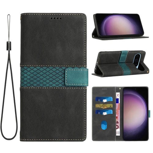 Funda de Cuero con Costuras en Cuadrícula para Google Pixel 9 y 9 Pro con Cordón (Negro)