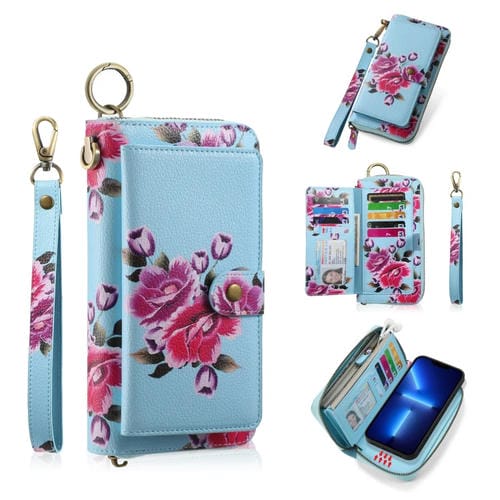 Funda de Cuero con Cremallera Multifuncional para iPhone 13 Pro Pola Magsafe Flower (Azul Cielo)