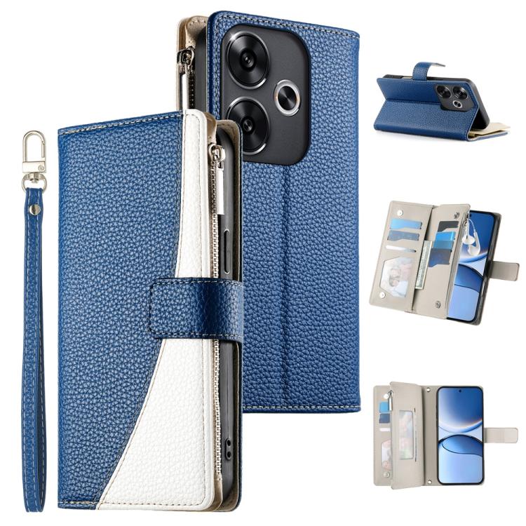 Funda de cuero con cremallera para Redmi Turbo 3 y Xiaomi Poco F6, con costuras, para múltiples tarjetas y correa corta (azul oscuro)