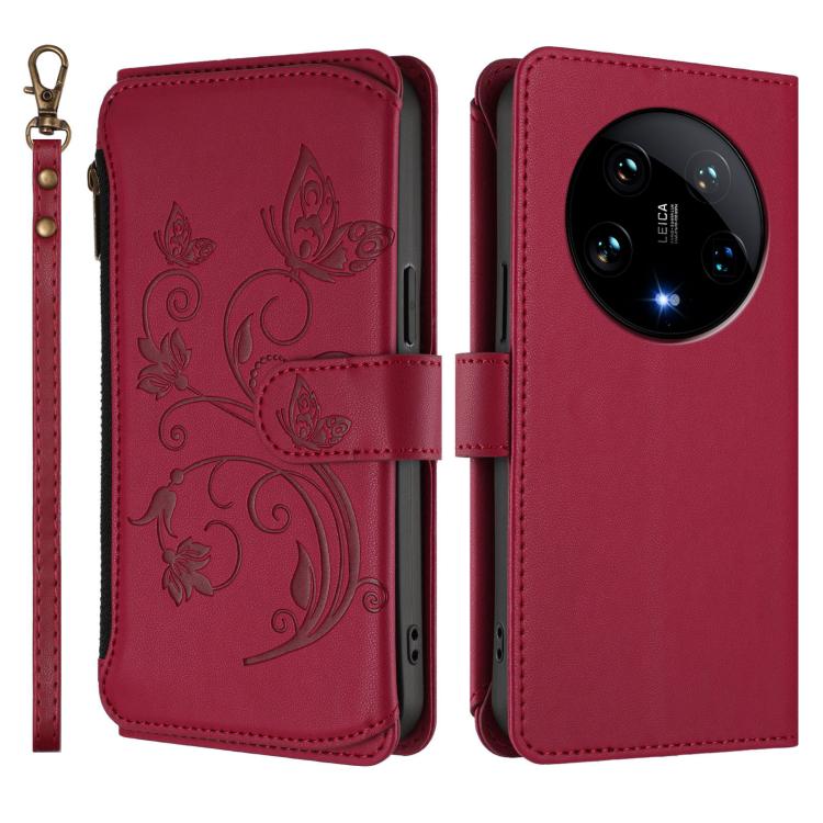 Funda de cuero con cremallera para Xiaomi 14 Ultra, diseño de mariposas, flores y múltiples tarjetas (rojo vino)