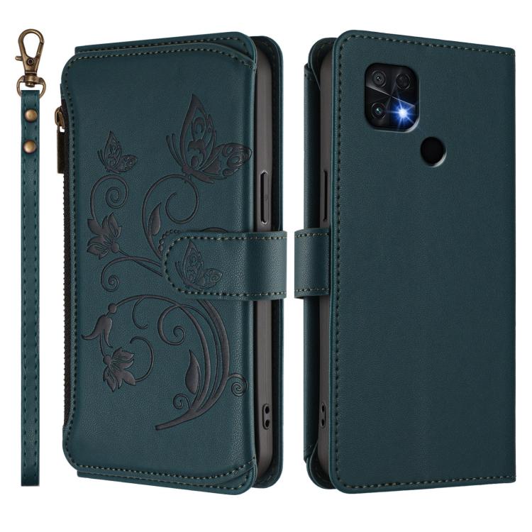 Funda de cuero con cremallera para Xiaomi Poco C40/Redmi 10C, diseño de mariposas y flores, con múltiples tarjetas (verde oscuro)