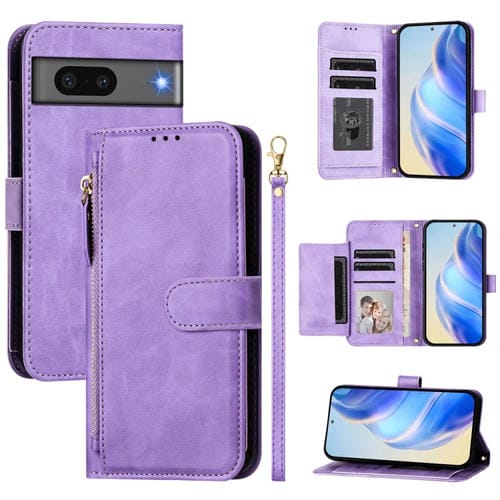 Funda de Cuero con Cremallera y Ranuras para Tarjetas para Google Pixel 7 (Morado)