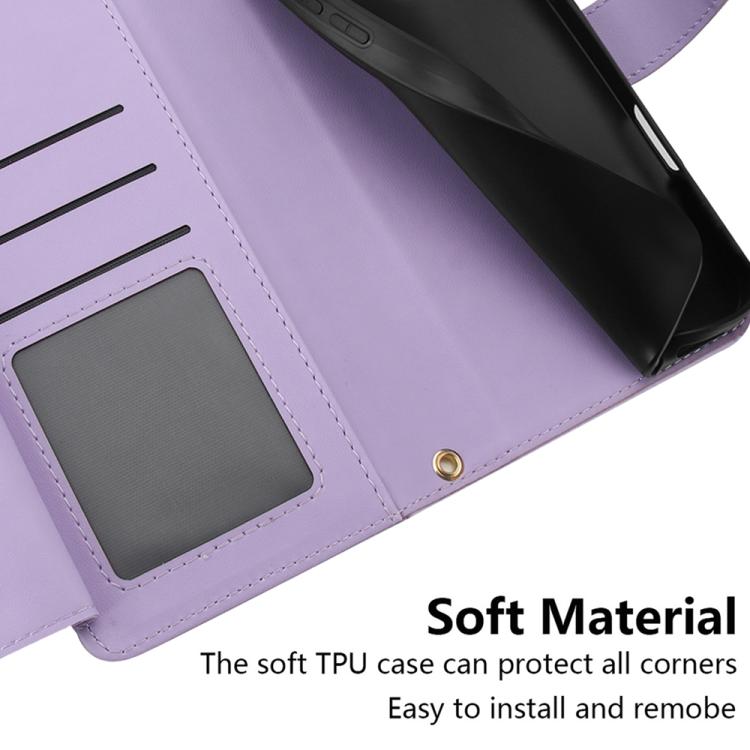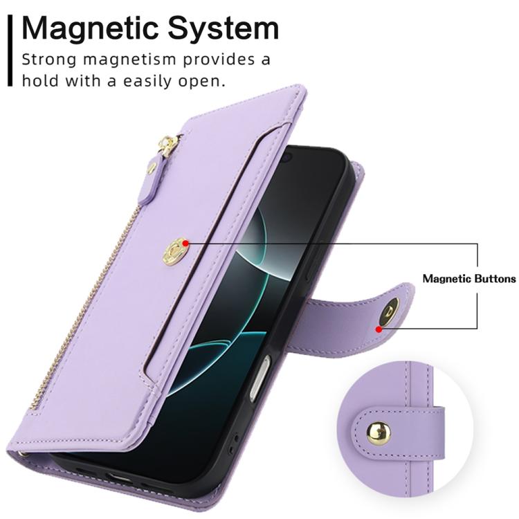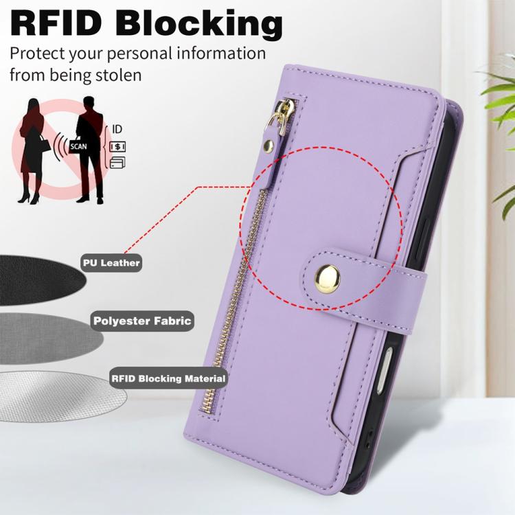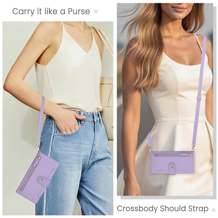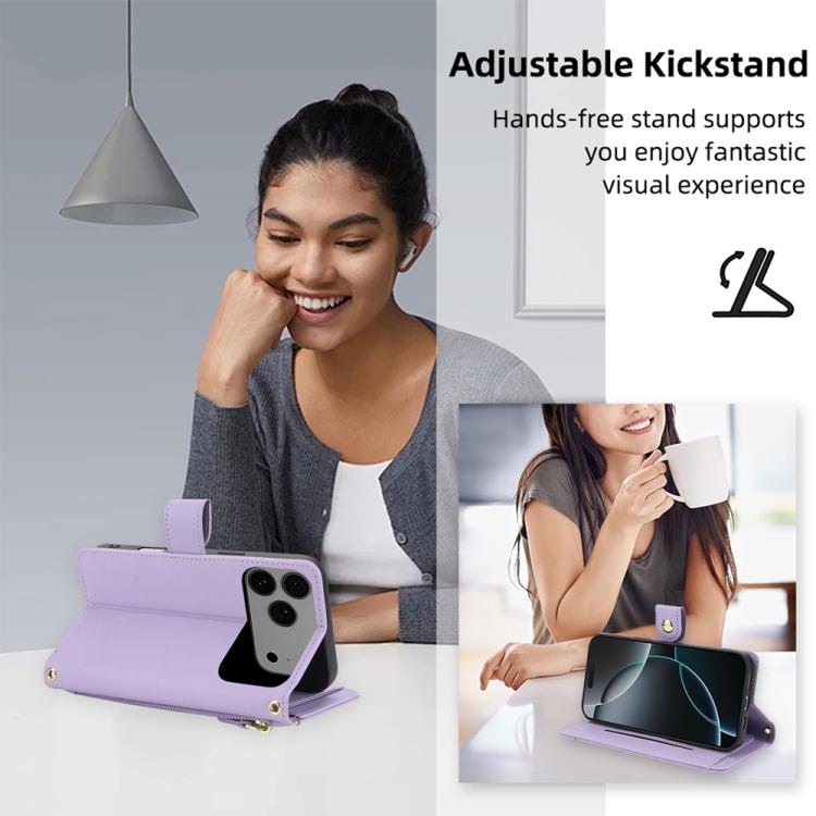 Funda de cuero con cremallera y siete ranuras para tarjetas para iPhone 17 Pro Max con cordón (morado claro)