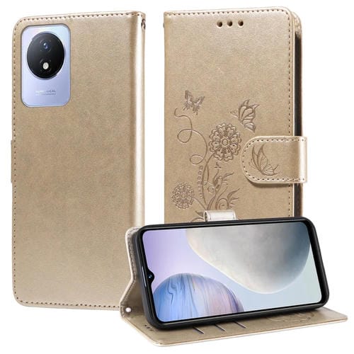 Funda de Cuero con Diseño de Mariposas y Flores En Relieve para Vivo Y02 4G / Y11 2023 / Y02A (Dorada)