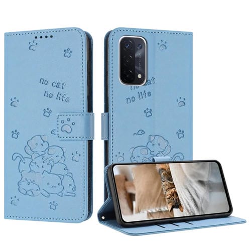 Funda de Piel con Diseño de Gatito En Relieve y Cordón para Oppo A74 5G / A93 5G (Azul)