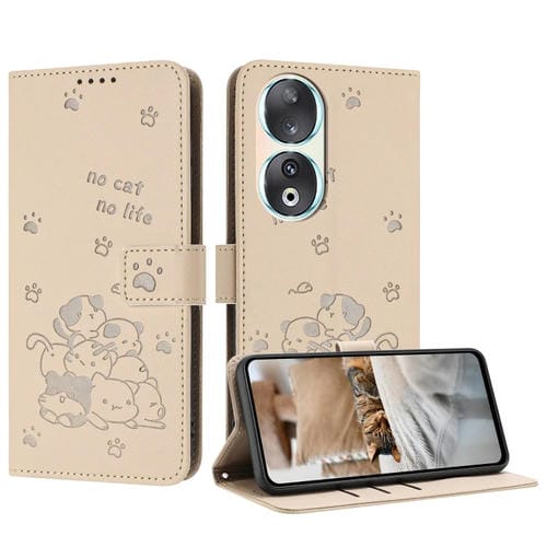 Funda de Cuero para Honor 90 con Diseño de Gatito en Relieve y Cordón (Beige)