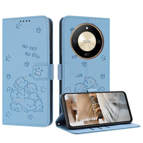 Funda de Piel para Honor X50/X9B con Diseño de Gatito en Relieve y Cordón (Azul)