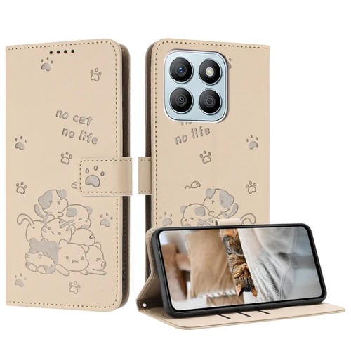 Funda de Piel para Honor X8B con Diseño de Gatito en Relieve y Cordón (Beige)