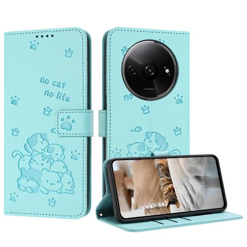 Funda de Piel con Diseño de Gatito En Relieve y Cordón para Redmi A3 4G Global / A3X 4G (Verde Menta)