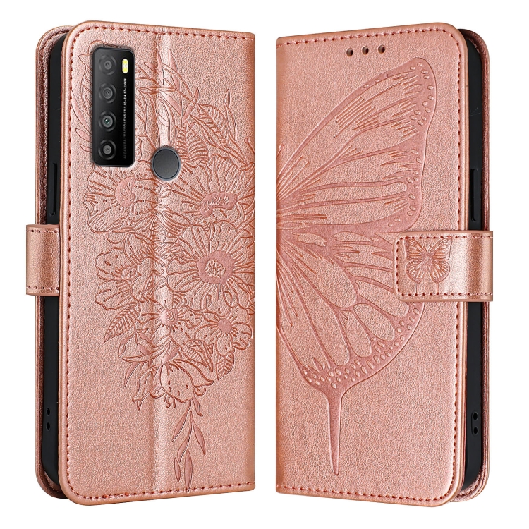 Funda de Cuero para TCL 30 XL T701Dl con Diseño de Mariposa En Relieve (Oro Rosa)