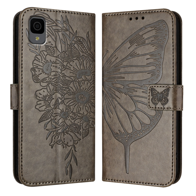 Funda de Cuero para TCL 30Z T602Dl con Diseño de Mariposa En Relieve (Gris)
