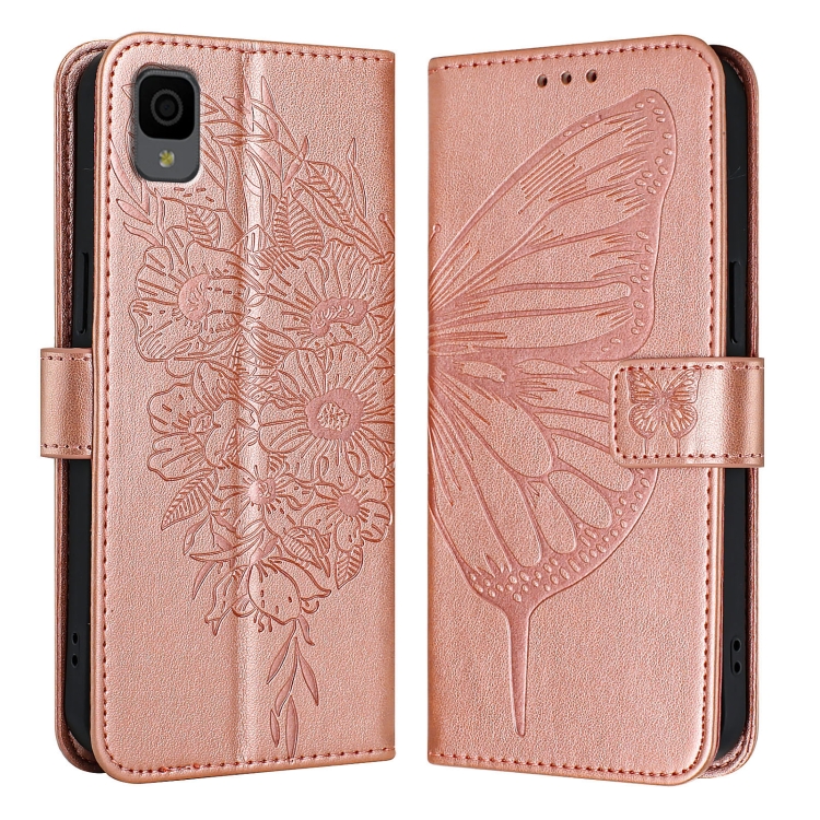Funda de Cuero para TCL 30Z T602Dl con Diseño de Mariposa en Relieve (Oro Rosa)