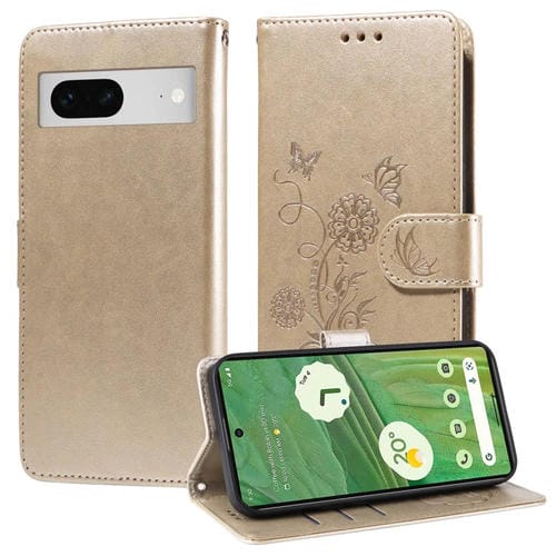 Funda de Cuero con Diseño de Mariposas y Flores en Relieve para Google Pixel 7 Pro (Dorada)