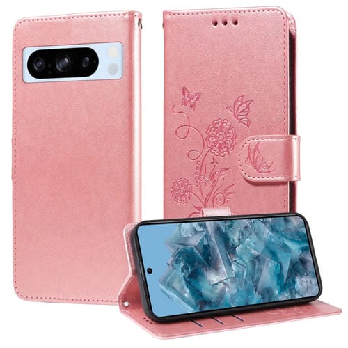 Funda de Cuero Google Pixel 8 Pro con Diseño de Mariposas y Flores en Relieve (Oro Rosa)