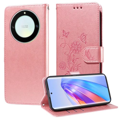 Funda de Cuero con Diseño de Mariposas y Flores en Relieve para Honor X9A 5G / Magic5 Lite / X40 5G (Oro Rosa)
