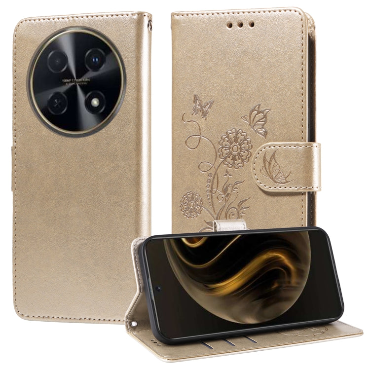 Funda de Cuero Huawei Enjoy 70 Pro 4G Nova 12I con Diseño de Mariposas y Flores en Relieve (Dorada)