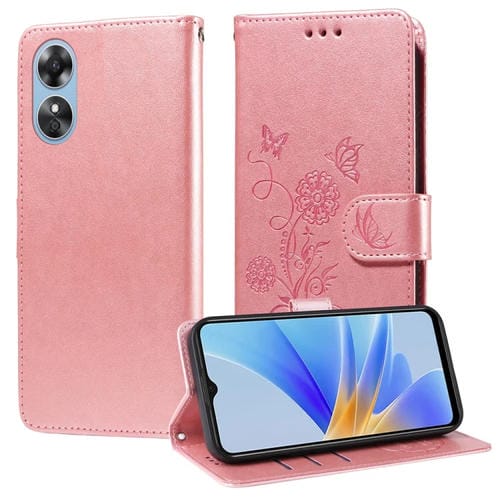 Funda de Cuero con Diseño de Mariposas y Flores En Relieve para Oppo A17 4G Global/A17K Global (Oro Rosa)
