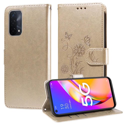 Funda de Cuero con Diseño de Mariposas y Flores En Relieve para Oppo A74 5G/A54 5G (Dorada)