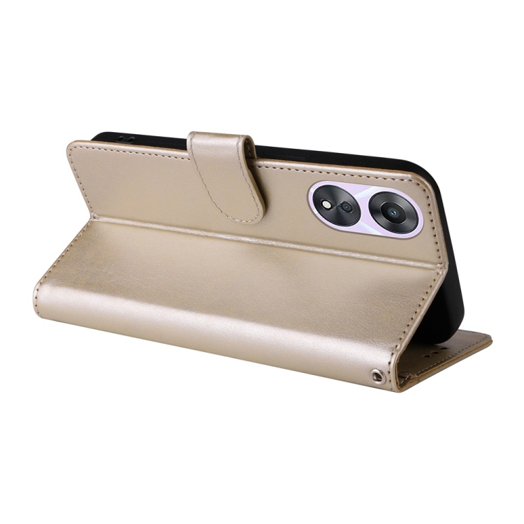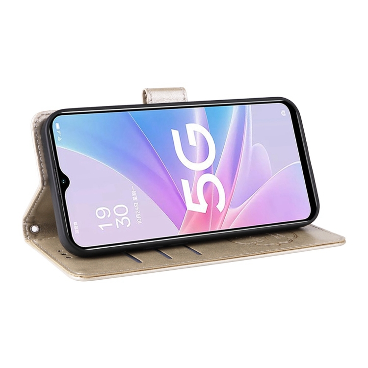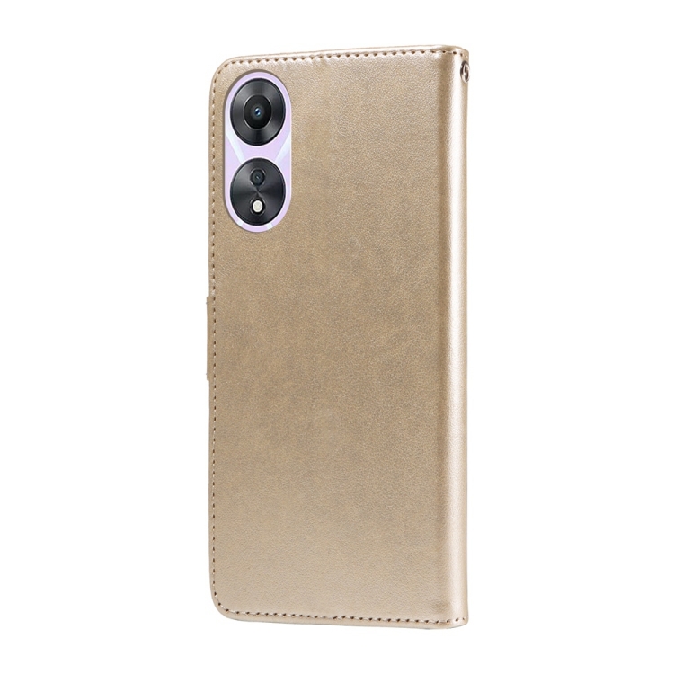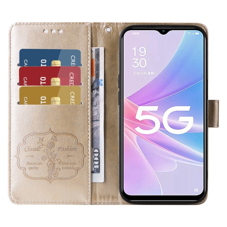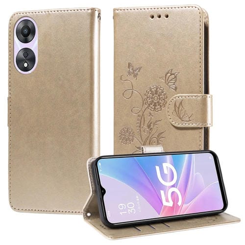 Funda de Cuero con Diseño de Mariposas y Flores En Relieve para Oppo A78 5G Global / A58X 5G / A1 Active (Dorada)
